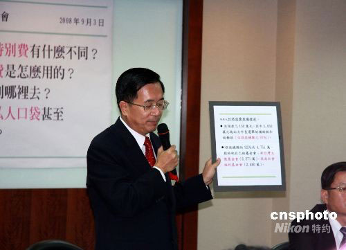 圖為被偵訊后,陳水扁下午在其卸任后的辦公室舉行記者會(huì),拿出制作的資料板緊“咬”馬英九。