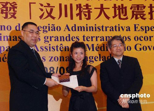 澳門特區(qū)政府社會(huì)文化司司長(zhǎng)崔世安(左)及衛(wèi)生局局長(zhǎng)李展?jié)?右)九月三日晚向澳門援助四川地震災(zāi)區(qū)的三批五十六名醫(yī)護(hù)人員逐一頒發(fā)獎(jiǎng)狀及四川省政府贈(zèng)送的“抗震救災(zāi)紀(jì)念章”,以表彰他們的貢獻(xiàn)。中新社發(fā) 畢永光 攝