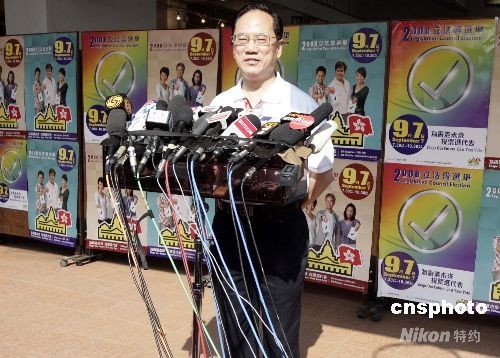 九月七日,香港舉行2008年立法會(huì)選舉,香港特區(qū)行政長(zhǎng)官曾蔭權(quán)和夫人曾鮑笑薇在高主教書院投票。圖為曾陰權(quán)在投票后接受媒體訪問。中新社發(fā) 張勤 攝