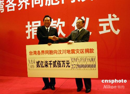 9月8日,受海峽交流基金會(huì)委托,海協(xié)會(huì)會(huì)長陳云林抵成都向汶川地震災(zāi)區(qū)轉(zhuǎn)交臺(tái)灣同胞自發(fā)捐助的二億七千二百萬元人民幣。圖為陳云林(左)向四川方面轉(zhuǎn)交臺(tái)灣同胞捐款。中新社發(fā) 黃永莉 攝
