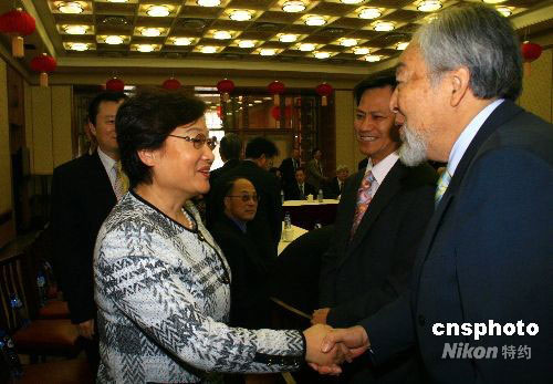 圖為李海峰主任與英國著名僑領(lǐng)單聲握手問候。