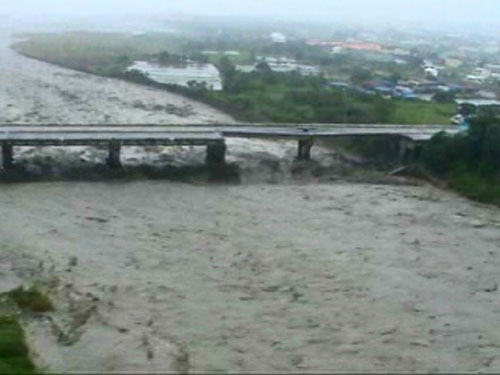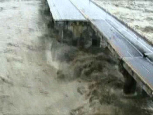 因森拉克臺(tái)風(fēng)豪雨影響,臺(tái)灣臺(tái)中縣后豐大橋日前發(fā)生斷裂垮塌,造成三車六人墜落橋下遭滾滾洪水沖走慘劇。圖為空中勤務(wù)總隊(duì)直升機(jī)空拍斷橋全景的鏡頭!爸醒肷纭眻D