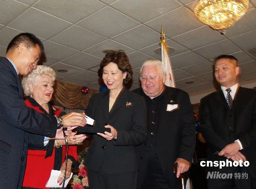 當?shù)貢r間9月29日,美國勞工部長趙小蘭到洛杉磯向亞裔民眾說明美國經(jīng)濟低迷“解套”辦法,為民眾打氣。加州眾議員陳文、核桃市議員林恩成、鉆石吧市議員張文彬等華人民選官員陪同參加。圖為華人代表向美國勞工部長趙小蘭贈送紀念品。 中新社發(fā) 盧威 攝