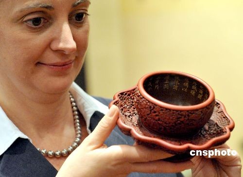 明朝永樂乾隆御題剔紅雙鳳蓮花盞托。