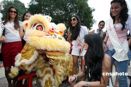 圖為各國(guó)佳麗為中國(guó)傳統(tǒng)舞獅吸引。