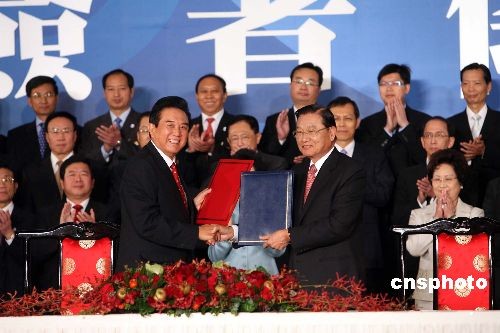 十一月四日,海協(xié)會(huì)與;鶗(huì)在臺(tái)北圓山飯店舉行歷史性的會(huì)談后,大陸海協(xié)會(huì)會(huì)長(zhǎng)陳云林與臺(tái)灣;鶗(huì)董事長(zhǎng)江丙坤下午十四時(shí)許在臺(tái)北就兩岸海運(yùn)、空運(yùn)、郵政、食品安全等議題簽署四項(xiàng)協(xié)議。中新社發(fā) 洪少葵 攝