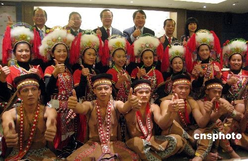 受兩岸兩會(huì)在臺(tái)北簽署四項(xiàng)協(xié)議等利多因素影響,11月19日,臺(tái)灣觀光業(yè)者首次大規(guī)模組團(tuán)“登陸”上海,參展“二00八中國國際旅游交易會(huì)”。臺(tái)灣觀光協(xié)會(huì)組織的三百余名業(yè)者及相關(guān)機(jī)構(gòu)代表甫抵上海,在臺(tái)商聚集的福泰商務(wù)酒店召開記者會(huì)。圖為臺(tái)灣南投縣九族文化村的少數(shù)民族歌舞團(tuán)隊(duì)亮相記者會(huì),表達(dá)臺(tái)灣民眾的好客之情。中新社發(fā) 許曉青 攝