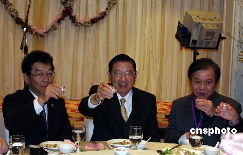 11月26日下午,海峽交流基金會(huì)董事長(zhǎng)江丙坤(中)抵達(dá)金門(mén),將出席27日舉辦的“福建地區(qū)臺(tái)商投資權(quán)益保障研討會(huì)”。他表示,希望兩岸共同打擊犯罪、金融登陸等議題能在六個(gè)月內(nèi)取得成果。圖為;鶗(huì)晚間宴請(qǐng)出席研討會(huì)的福建近百位臺(tái)商。中新社發(fā) 周兆軍 攝