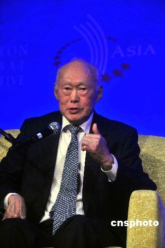 圖為克林頓與新加坡資政李光耀(左)進(jìn)行對話。