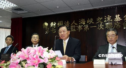 12月2日下午,海峽交流基金會在臺北舉行第7屆董監(jiān)事會第1次聯(lián)席會議,江丙坤(右二)經(jīng)推選續(xù)任;鶗麻L,高孔廉(左二)、“陸委會”副主委傅棟成(左一)和知名企業(yè)家許勝雄(右一)經(jīng)推舉出任;鶗倍麻L,高孔廉兼任;鶗貢L。中新社發(fā) 劉舒凌 攝