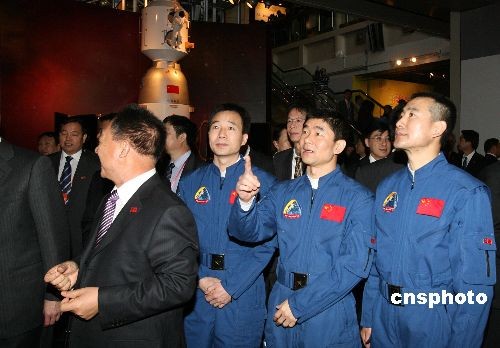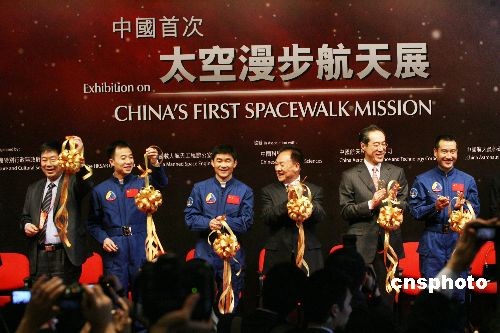 十二月六日,“中國首次太空漫步航天展”在香港科學館揭幕,神舟七號返回艙、航天服和航天員出艙后所展示的國旗等珍貴展品和圖片在展會上亮相。香港特區(qū)政府政務司司長唐英年、神舟七號載人航天飛行赴港代表團團長暨中國載人航天工程副總指揮張建啟、神七航天員翟志剛、劉伯明、景海鵬等出席揭幕儀式。中新社發(fā) 武仲林 攝
