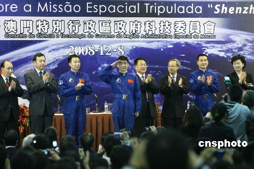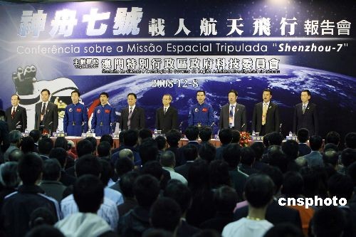 十二月八日,“神舟七號”載人航天飛行代表團(tuán)在澳門舉行報(bào)告會。代表團(tuán)團(tuán)長、中國載人航天工程副總指揮張建啟、中國航天員翟志剛、劉伯明、景海鵬,以及載人航天工程有關(guān)系統(tǒng)的負(fù)責(zé)人等出席。中新社發(fā) 武仲林 攝