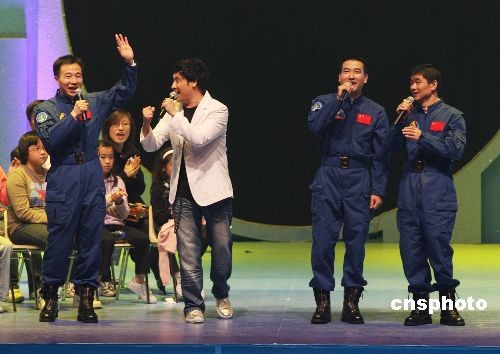 十二月九日晚,澳門舉行“航天英雄·情系濠江”晚會,歡迎“神舟七號”載人航天飛行代表團(tuán)一行。圖為翟志剛、劉伯明、景海鵬三位航天員與澳門歌手合唱《龍的傳人》。中新社發(fā) 武仲林 攝