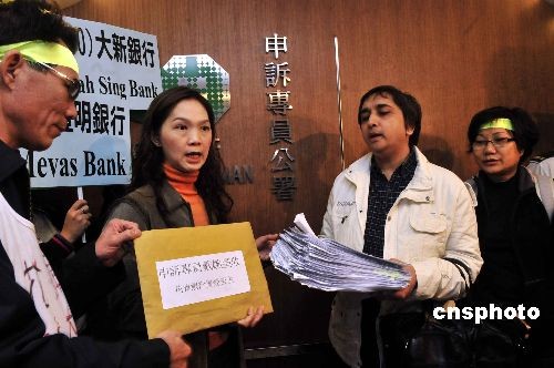 十二月十二日,香港數(shù)百名購(gòu)買(mǎi)了雷曼相關(guān)產(chǎn)品的市民發(fā)起游行。圖為苦主代表向申訴專(zhuān)員公署投訴金融管理局監(jiān)管不力。中新社發(fā) 譚達(dá)明 攝