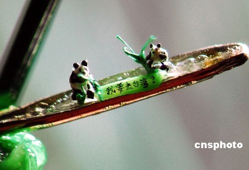 為了迎接12月23日大熊貓“團(tuán)團(tuán)”、“圓圓”的到來(lái),臺(tái)灣著名微雕家陳逢顯特地花了半個(gè)多月的時(shí)間,以樹脂凝膠為材質(zhì),雕刻了一雄、一雌兩只坐在繡花針孔中的立體大熊貓,拉著寫有“我要去臺(tái)灣”的條幅。以表達(dá)他對(duì)團(tuán)團(tuán)、圓圓到來(lái)喜悅的心情。中新社發(fā) 陳立宇 攝