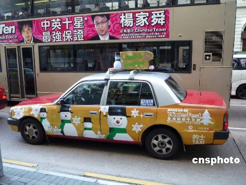 2008年12月20日,香港尖沙咀彌敦道出現(xiàn)“圣誕的士”。隨著圣誕節(jié)的臨近,香港一些出租車在車外殼畫上圣誕圖畫,烘托香港圣誕節(jié)氛圍。中新社發(fā) 姜純 攝