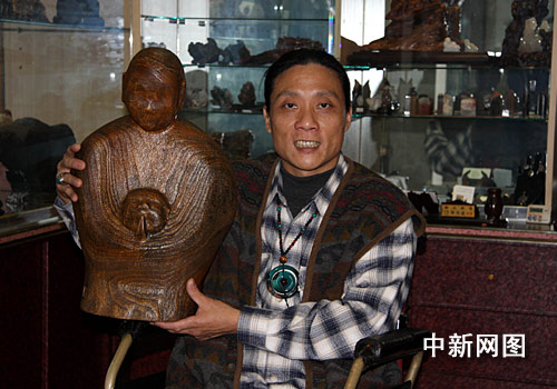 臺(tái)灣知名殘障木雕家林正發(fā),年青時(shí)不幸因車禍而不良于行。但并沒因此喪志。反而一心致力于木雕藝術(shù)的創(chuàng)作。成為一個(gè)自食其力的人。曾多次獲臺(tái)灣木雕比賽大獎(jiǎng)。圖為林正發(fā)和他的新作“佑”。以抽象的藝術(shù)手法來(lái)表現(xiàn)虔誠(chéng)的宗教觀念。