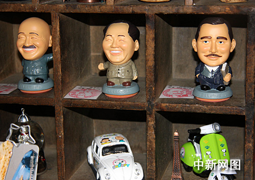 毛澤東、孫中山、蔣介石公仔如今不僅在中國國民黨黨史館中很受大陸游客的歡迎,在臺灣不少禮品店中也有出售,圖為臺北縣碧潭一家禮品店中的毛澤東、孫中山、蔣介石公仔。老板說,銷路不錯(cuò)。陳立宇 攝