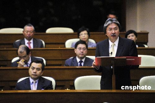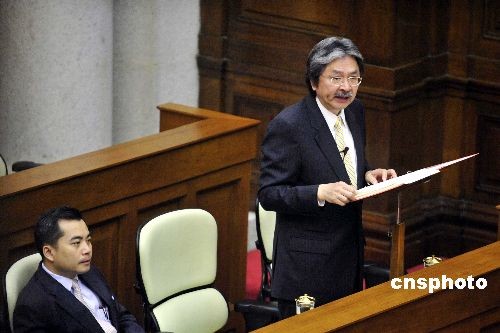 二月二十五日,香港特區(qū)財政司司長曾俊華在立法會大樓會議廳向立法會提交二零零九至二零一零年度財政預(yù)算案。中新社發(fā) 譚達明 攝