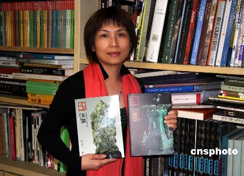 一套共十二冊由北京故宮博物院紫禁城出版社授權(quán)、介紹北京故宮博物院藏寶的書籍,由臺(tái)灣藝術(shù)家出版社出版。圖為該出版社的工作人員展示該套書籍中的兩冊。中新社發(fā) 陳立宇 攝