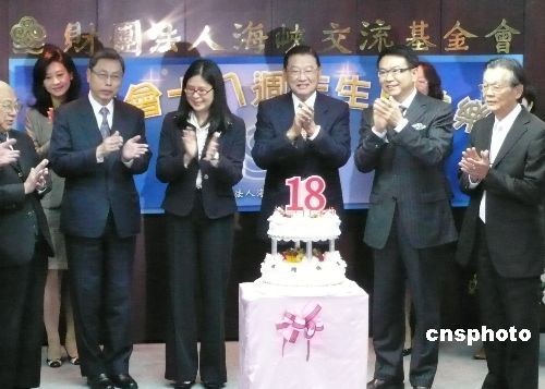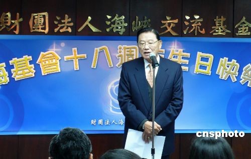 三月九日,臺(tái)灣海峽交流基金會(huì)在臺(tái)北舉辦成立十八周年慶;顒(dòng)。該會(huì)董事長(zhǎng)江丙坤表示,兩岸“大三通”基本實(shí)現(xiàn)后,其效果逐漸顯現(xiàn),;鶗(huì)未來(lái)將會(huì)繼續(xù)推動(dòng)兩岸制度性協(xié)商,共期兩岸和平,經(jīng)濟(jì)繁榮。中新社發(fā) 路梅 攝
