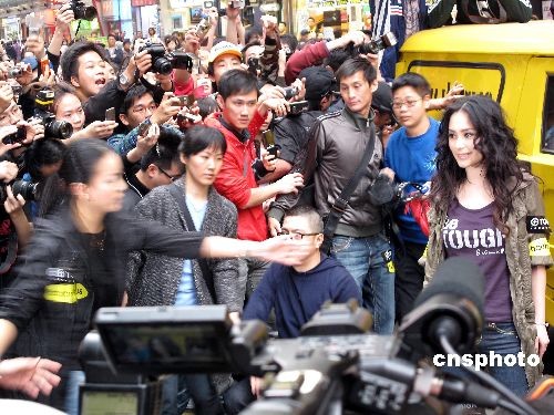 三月十一日,藝人不雅照女主角之一的鐘欣桐(阿嬌)復(fù)出后首次現(xiàn)身香港鬧市街頭,引來(lái)數(shù)百人圍觀,爭(zhēng)相拍攝。阿嬌復(fù)出后首份工作是擔(dān)任一個(gè)牛仔褲品牌的代言人,當(dāng)日出席該品牌一分店的宣傳活動(dòng)。中新社發(fā) 黎金良 攝