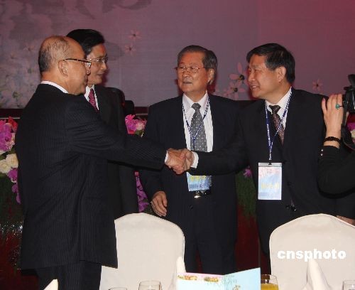 三月二十日晚,中國國民黨主席吳伯雄(左一),在臺(tái)北圓山大飯店會(huì)見前來出席“二零零九第三屆海峽兩岸客家高峰論壇”的北京聯(lián)合大學(xué)黨委書記徐永利(右一)。中新社發(fā) 耿軍 攝