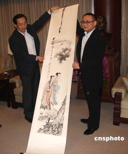 三月二十五日,由十七家大陸中央媒體負(fù)責(zé)人組成的訪(fǎng)問(wèn)團(tuán)拜訪(fǎng)臺(tái)灣《聯(lián)合報(bào)》。圖為訪(fǎng)問(wèn)團(tuán)團(tuán)長(zhǎng)、《人民日?qǐng)?bào)》總編輯吳恒權(quán)(左)向《聯(lián)合報(bào)》贈(zèng)送禮品。中新社發(fā) 耿軍 攝
