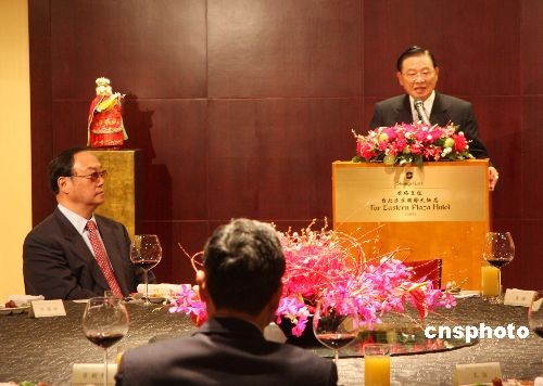 大陸海協(xié)會(huì)副會(huì)長(zhǎng)安民四月六日率“海協(xié)會(huì)經(jīng)貿(mào)交流考察團(tuán)”一行十四人抵達(dá)臺(tái)灣,開(kāi)始為期七天的訪問(wèn)。臺(tái)灣海基會(huì)董事長(zhǎng)江丙坤在香格里拉臺(tái)北遠(yuǎn)東國(guó)際大飯店宴請(qǐng)安民一行。 中新社發(fā) 耿軍 攝