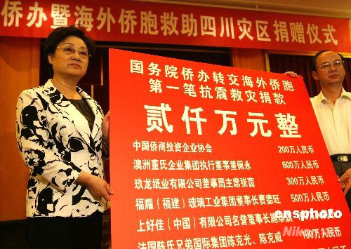 國務院僑辦主任李海峰五月十五日飛抵四川省會成都,立即向汶川地震災區(qū)轉交海外僑胞捐贈的第一批救災捐款兩千萬元。她含著熱淚宣布,馬上將有更多的海外僑胞救災捐款送到災區(qū)。中新社發(fā) 賈國榮 攝