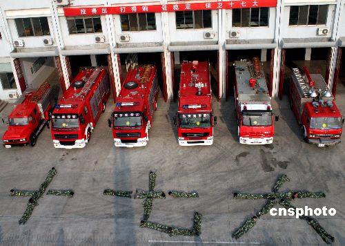 10月17日,江蘇連云港消防支隊特勤中隊21名即將退伍的老兵,在操場上交接班時,組成了“十七大”的字樣,以此特殊形式向十七大獻(xiàn)禮。中新社發(fā) 王振<江蘇> 攝