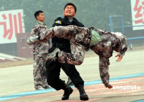 中國武警部隊(duì)特勤大隊(duì)11月12日上午在北京舉行摔擒演練等訓(xùn)練科目表演。來自42個(gè)國家的59名駐華武官,參觀了這次武警官兵表演的搏擊拳、射擊、一招制敵、戰(zhàn)術(shù)基礎(chǔ)動(dòng)作、五人戰(zhàn)斗小組情況處置演練、公共汽車反劫持等訓(xùn)練科目表演,并參觀了大隊(duì)部分武器裝備。這支組建于2002年12月的部隊(duì),是美國“9·11”事件后,中國為防范和打擊恐怖主義而專門組建的反恐特種部隊(duì),共四百余人,主要擔(dān)負(fù)處置重大恐怖事件中心區(qū)武力突擊任務(wù)。他們先后四次參加國家級反恐綜合演習(xí),并參加了“合作-二00七”中俄聯(lián)合反恐演習(xí),目前已初步具備了反恐制勝的作戰(zhàn)能力。中新社發(fā) 宋吉河 攝