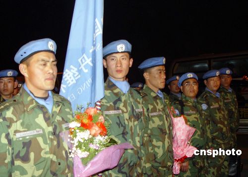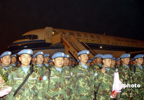 二十三日晚間二十一時許,中國赴蘇丹達爾富爾維和工兵先遣分隊一百三十五名官兵,在鄭州新鄭國際機場乘南航包機啟程,前往非洲。圖為啟程前,維和官兵同中外記者見面,并接受采訪。中新社發(fā) 李志全 攝