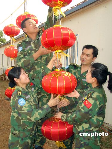 中國第三批赴蘇丹瓦烏維和部隊(duì)為使官兵在環(huán)境艱苦、條件惡劣的任務(wù)區(qū)度過一個祥和、愉快的春節(jié),堅持以人為本,積極克服聯(lián)合國后勤供應(yīng)不及時的困難,立足現(xiàn)有條件、因地制宜,科學(xué)安排,勤儉節(jié)約,較好地保證了在春節(jié)期間,官兵飲食有保障,過年有氛圍。中新社發(fā) 劉恩海 攝