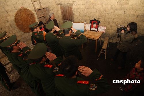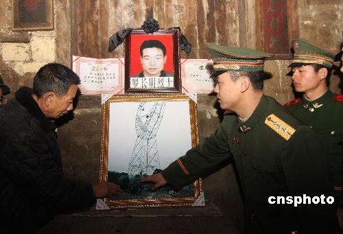 2月20日,武警湖南總隊(duì)婁底市支隊(duì)官兵來(lái)到湖南省漣源市白馬鎮(zhèn)楊世村,給在除冰搶險(xiǎn)中英勇殉職的電力英雄羅長(zhǎng)明、羅海文烈士家屬送去了湯圓、水果、慰問(wèn)金等元宵節(jié)禮物。當(dāng)天,剛剛從搶修500千伏的五民線路(英雄生前搶修過(guò)的電網(wǎng))歸來(lái)的武警婁底市支隊(duì)官兵來(lái)到烈士家中。向烈士遺像前深深鞠躬,送來(lái)了一份特殊的慰問(wèn)禮物——兩幅用鏡框鑲嵌裱好的照片,這正是烈士生前搶修電網(wǎng)時(shí)倒塌的43號(hào)鐵塔。英雄辭世后,武警官兵接過(guò)烈士手中的槍,繼續(xù)英雄生前未盡的事業(yè),經(jīng)過(guò)十幾天的緊急搶修,現(xiàn)在43號(hào)鐵塔重新矗立,整條線路順利通電。中新社發(fā) 郭國(guó)權(quán) 攝