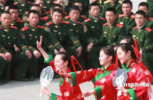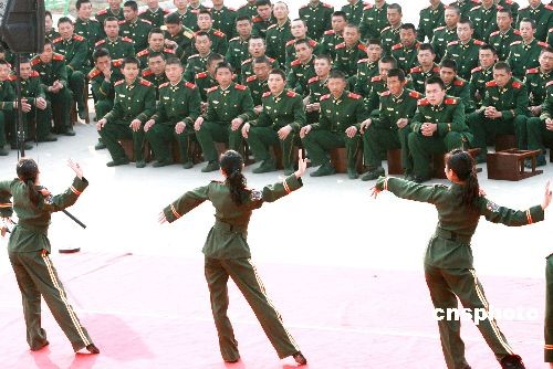 2月22日,武警江蘇總隊(duì)文工團(tuán)演員為蘇州武警官兵表演舞蹈。當(dāng)日,武警江蘇總隊(duì)政治部文工團(tuán)組織“慰問(wèn)抗雪救災(zāi)一線官兵及新戰(zhàn)友專(zhuān)場(chǎng)文藝巡演”之首場(chǎng)演出活動(dòng),在蘇州武警支隊(duì)新兵營(yíng)訓(xùn)練場(chǎng)熱鬧開(kāi)演。中新社發(fā) 蘇秀 攝