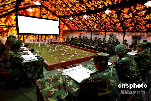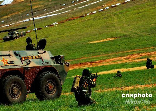 9月中下旬,參加“礪兵-2008”的濟南軍區(qū)某機械化步兵旅,在塞北荒原綜合訓(xùn)練基地進行實兵立體對抗演練。近百輛戰(zhàn)車和坦克兵分多路向“敵”陣地發(fā)起攻擊。中新社發(fā) 張振興 攝