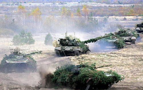 白俄羅斯軍隊的坦克參加演習(xí)。