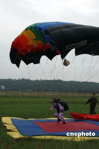 11月初,第七屆中國國際航空航天博覽會上,中國空軍跳傘運動大隊的27名隊員先后進行了跳傘表演,其中的喜從天降、航空盛典、東方之珠、金龍飛舞、空中彩虹等精彩課目。圖為空軍跳傘運動大隊隊員肖茜蓉帶著鮮艷的五星紅旗第一個從天而降。中新社發(fā) 譚超 攝