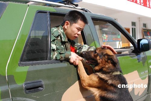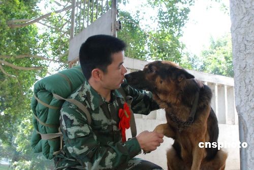十一月二十四日,武警福建總隊直屬支隊的訓(xùn)犬員張世均與息息相處五年的無言戰(zhàn)友“飛虎”依依惜別。又到老兵退伍的日子,在武警福建總隊服役期滿的三千多名老兵,開始踏上返鄉(xiāng)的路程。中新社發(fā) 曾朝群 攝