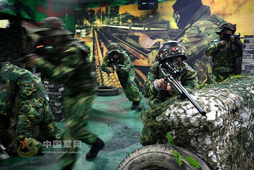 “Go,Go,Go!”12月2日下午, 一場(chǎng)激烈的“戰(zhàn)斗”對(duì)決在一塊特殊的陣地上進(jìn)行。“戰(zhàn)場(chǎng)”上矮墻林立、沙包堆積、枯樹橫亙,周圍則“炮火”連天,上空“飛機(jī)”盤旋……。戰(zhàn)士們身著作戰(zhàn)服,手持仿真槍,頭戴裝有感應(yīng)器的頭盔,在時(shí)明時(shí)暗的“夜空”下穿梭,尋找目標(biāo),激烈對(duì)抗。這是某炮兵團(tuán)日前建成的真人CS對(duì)抗陣地上的精彩一幕。據(jù)前來觀摩的總部領(lǐng)導(dǎo)介紹,實(shí)施真人CS對(duì)抗練兵在我軍部隊(duì)還是首家。