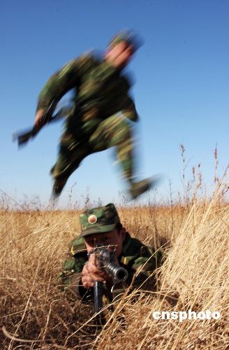 2008年12月25日,濟南軍區(qū)某部正在組織官兵進行戰(zhàn)術(shù)訓練。連日來,該部把官兵拉到野外生疏地域,著力開展嚴寒條件下的冬季野營訓練,全面鍛煉部隊在嚴寒條件下的整體作戰(zhàn)能力。中新社發(fā) 梁志杰 攝