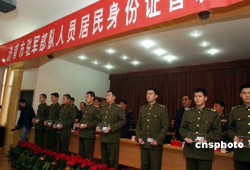 2009年2月26日,濟(jì)南警備區(qū)、濟(jì)南市公安局聯(lián)合舉行駐濟(jì)部隊(duì)現(xiàn)役軍人居民身份證首發(fā)儀式。自此,濟(jì)南市為駐濟(jì)部隊(duì)申領(lǐng)發(fā)放具名身份證工作正式啟動(dòng)。此舉將對(duì)部隊(duì)人員辦理儲(chǔ)蓄、保險(xiǎn)、買(mǎi)車(chē)、購(gòu)房等涉及個(gè)人權(quán)益事物時(shí)帶來(lái)便捷。中新社發(fā) 龔輝 攝