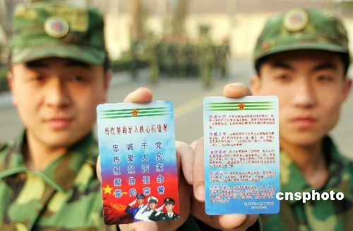 3月9日,部隊官兵正在展示革命軍人核心價值觀“銘記卡”。為加深官兵對當(dāng)代革命軍人核心價值觀的理解掌握,濟(jì)南軍區(qū)某部為每名官兵制作了一張小巧精美的當(dāng)代革命軍人核心價值觀“銘記卡”,正面是五個方面的基本內(nèi)容,背面是簡要的基本內(nèi)涵,官兵們可以隨時從衣兜里取出背記。中新社發(fā) 梁志杰 攝