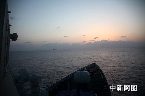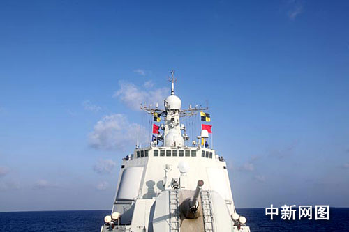 當(dāng)?shù)貢r(shí)間四月十三日清晨六時(shí)許,剛剛完成第四十批次七艘中外商船護(hù)航任務(wù)的中國(guó)海軍首批護(hù)航編隊(duì),與前來(lái)接替執(zhí)行護(hù)航任務(wù)的第二批護(hù)航編隊(duì),在亞丁灣東部預(yù)定海域順利會(huì)合!昂?凇碧(hào)導(dǎo)彈驅(qū)逐艦高高升掛起彩旗,歡迎海軍第二批護(hù)航編隊(duì)的到來(lái)。中新社記者 孫自法 攝