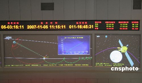 北京時間11月5日11時37分,北京航天飛行控制中心對“嫦娥一號”衛(wèi)星成功實施了第一次近月制動,順利完成第一次“太空剎車減速”動作,月球捕獲衛(wèi)星。“嫦娥一號”順利進(jìn)入環(huán)月軌道,成為中國第一顆月球衛(wèi)星。中新社發(fā) 孫自法 攝
