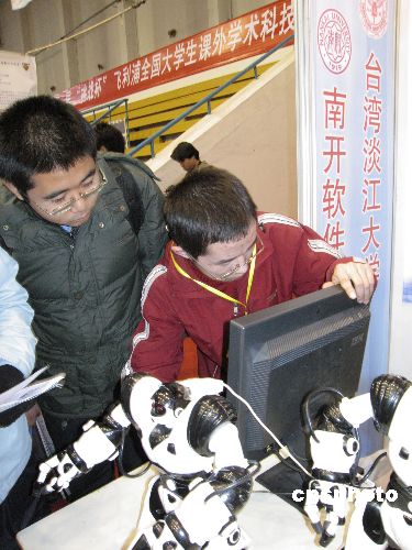 11月15日,第十屆“挑戰(zhàn)杯”飛利浦全國(guó)大學(xué)生課外學(xué)術(shù)科技作品競(jìng)賽決賽在南開(kāi)大學(xué)開(kāi)幕。在學(xué)生科技作品展示環(huán)節(jié)中,由南開(kāi)大學(xué)與臺(tái)灣淡江大學(xué)合作研發(fā)的“mychannel虛擬電視臺(tái)”和“桌面機(jī)器人輔助多模即時(shí)交流平臺(tái)”格外引人關(guān)注。淡江大學(xué)參賽隊(duì)指導(dǎo)教師蕭瑞祥介紹:“從決定合作到作品完成,經(jīng)歷了將近一年時(shí)間。中新社發(fā) 田齊 攝