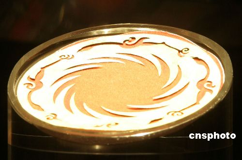 十一月十九日,成都金沙遺址出土的“太陽神鳥”金飾在該遺址博物館展出,在聚光燈下金光閃閃。該金飾已成為金沙遺址博物館鎮(zhèn)館之寶,其圖案也已被確定為中國文化遺產(chǎn)標志。中新社發(fā) 孫自法 攝