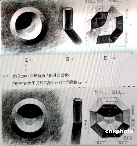 | 2007年12月6日,海南在京的一位畫家從光學(xué)角度找到中美兩“月亮”鮮明差別。中國嫦娥首幅月球圖像抄襲美國的傳言,在網(wǎng)上一度鬧得沸沸揚(yáng)揚(yáng),海南省畫家、超常創(chuàng)意專家于廣勝在北京,反復(fù)對(duì)照中美兩圖琢磨研究,從光學(xué)角度發(fā)現(xiàn)兩幅圖象有著“更加鮮明的差別”,6日早晨他發(fā)現(xiàn)兩幅圖像是在不同的光源下拍攝的,從另一側(cè)面有力證明了我國嫦娥傳回圖像的真實(shí)性。于廣勝說,這一證據(jù)是普通大眾不易發(fā)現(xiàn)的,但通過他所手繪的幾幅圖,即可讓普通大眾一目了然。同時(shí),凡是對(duì)光學(xué)有所研究或通曉繪畫用光、攝影和攝像用光的人們,自然明白其理。為了便于廣大讀者理解,他把地球上的環(huán)形山簡(jiǎn)化為內(nèi)凹外凸的圓臺(tái)(圖1-1、2-1),以顯現(xiàn)不同光線來源下的不同光影效果;由此,又進(jìn)一步簡(jiǎn)化為內(nèi)凹外凸八棱臺(tái)(圖1-3、2-3)并標(biāo)注了光線的來源和受光、測(cè)光、背光區(qū)域;同時(shí),又畫了一個(gè)圓柱體(1-2、2-2)以顯現(xiàn)不同光照角度下的不同投影方向。通過兩組手繪圖,中國與美國公布的兩張圖像在拍攝時(shí),太陽光照射月球角度明顯不同,至少左右相差42度左右。中國拍攝時(shí)的太陽光線來源于左前方,而美國拍攝時(shí)的太陽光線來源于正前方稍微偏右。于廣勝說,稍有電腦平面制作、攝影和攝像后期制作知識(shí)的人們都明白,圖片與圖片的任意組合拼接是輕而易舉的,但要想把圖片中各個(gè)圖像所有細(xì)節(jié)的光影全部改變是不可能的,“由此可見,我國嫦娥傳回的圖像其真實(shí)性是不容質(zhì)疑了!毕嚓P(guān)鏈接:12月2日,中國探月工程首席科學(xué)家、中國科學(xué)院院士歐陽自遠(yuǎn)做客上!拔膮R講堂”,對(duì)關(guān)于“嫦娥首幅月球圖像抄襲美國”的傳言作出澄清:“嫦娥傳回的圖像確實(shí)是真實(shí)的,是經(jīng)過非常復(fù)雜的拍攝、傳輸、接收、處理過程后得到的,并且與美國所拍的圖像有細(xì)微差別”。我國嫦娥一號(hào)衛(wèi)星所攝的月面圖像上,某個(gè)地方有兩個(gè)小坑,而美國2005年最新確認(rèn)的月面圖像上,同樣的地方只有一個(gè)小坑。中新社發(fā) 善平 攝