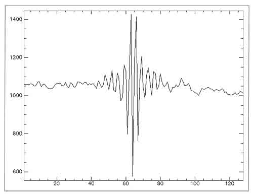 圖2、干涉曲線(橫軸為干涉曲線采樣點數(shù),縱軸為灰度值,本圖是圖1從左到右第65列對應的干涉曲線)